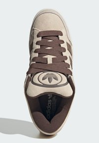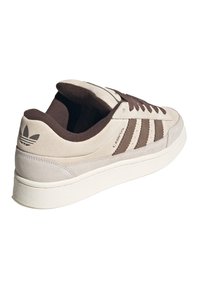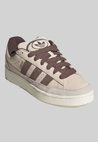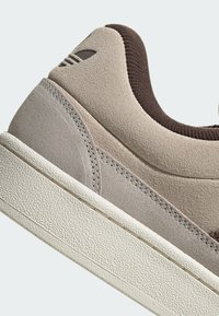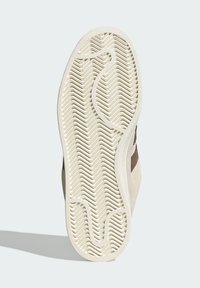 Beige suède sneaker met bruine accenten, voorzien van drie strepen aan de zijkant, een geplooide kraag en een witte rubberen zool.