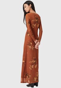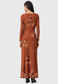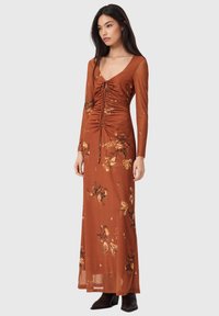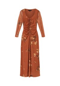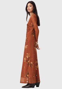 Rustkleurige maxi-jurk met lange mouwen en bloemenprint; voorzien van een gerimpelde voorkant en strikdetail; zachte, vloeiende stof; paar enkellaarzen zichtbaar.