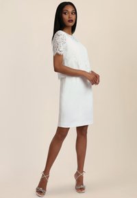 Vrouw draagt een witte knielange kanten jurk met korte mouwen en witte sandalen met strikjes, poserend tegen een lichte achtergrond.