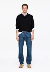 Zwarte pullover met kraag over een lichtblauw overhemd, gecombineerd met loszittende blauwe spijkerbroek en beige schoenen. Eenvoudig ontwerp, textuurstof.