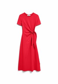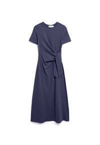 Knielange, kortärmige jurk van gedempt olijfgroen materiaal, met een detail van een knoop aan de voorkant. Glad textuur met een rechte pasvorm. Lichte stof.
