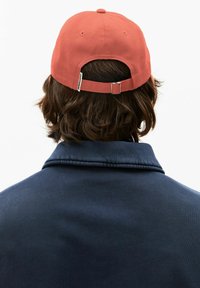 Jonge man met halflang donker haar, een rode pet met wit logo en een marineblauwe sweater met rits en bijpassende logopatch.
