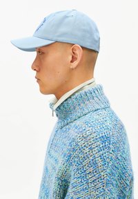Jonge man met middellang bruin haar, die een witte en marineblauwe pet draagt met de tekst "ARMEDANGELS" en een marineblauwe jas met ritssluiting tegen een witte achtergrond.