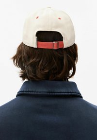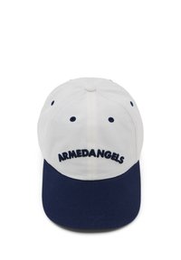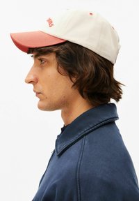 Jonge man met middellang bruin haar, een beige en roze pet met de tekst "Armedangels" en een marineblauwe jas met rits, kijkt recht vooruit.