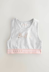 Drie mouwloze cropped tops voor jongeren in roze, grijs en roze bloemenprint, allemaal met de tekst "Baker by Ted Baker" op de voorkant en elastische zoombanden.