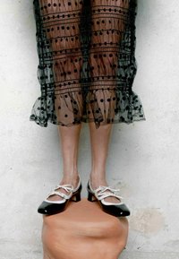 Benen met een doorschijnende zwarte stippenrok en zwart-witte lage hakken, staand op een ronde terracotta sokkel tegen een lichte muur.
