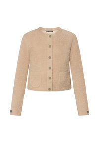 Zwarte cropped cardigan met een zachte, pluizige textuur; ronde halslijn; sluiting met knopen aan de voorkant; twee zakken aan de voorkant; lange mouwen.