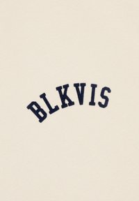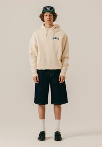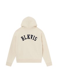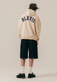 Persoon draagt een beige hoodie met de tekst "BLKVIS" op de achterkant, donkerkleurige knielange shorts, witte sokken, zwarte schoenen en een zwarte pet met witte strepen.