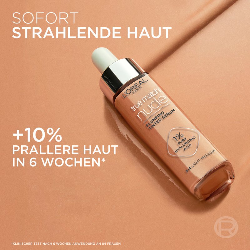 Flesje L’Oréal True Match Nude opvullend getint serum op een beige achtergrond met tekst waarin staat 10% stevigere huid in 6 weken en hyaluronzuurgehalte.
