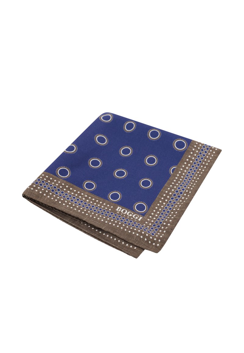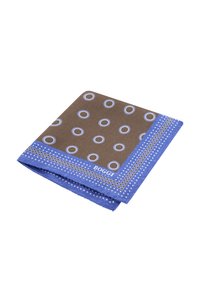 Blauw en bruin opgevouwen zakdoek met witte en blauwe cirkelpatronen en een gestippelde rand.