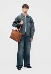 Jonge man draagt oversized spijkerjasje en wijd uitlopende jeans, houdt een grote bruine leren boodschappentas met schouderriem vast.