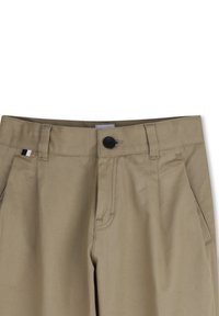 Beige casual broek met zijzakken, lussen voor een riem, een knoopsluiting en een recht model op een witte achtergrond.