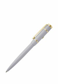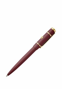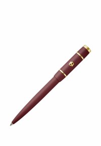 Bordeauxrode balpen met gouden clip en afwerking, met dop, schuin diagonaal op witte achtergrond.