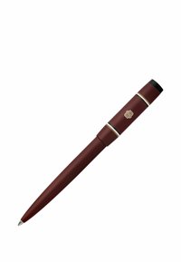 Donkerrode balpen met zwarte clip en gouden accenten, met dop, diagonaal geplaatst op een witte achtergrond.