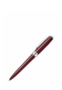 Strakke bordeauxrode retractable balpen met zilveren clip en decoratieve zilveren ring vlak bij de bovenkant.