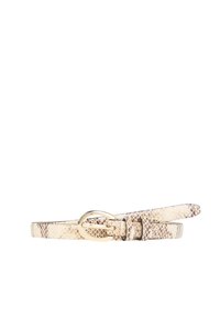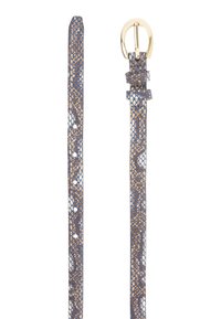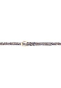 Slanke bruine en blauwe riem met slangenhuidpatroon, goudkleurige ronde metalen gesp en twee riemlussen op witte achtergrond.