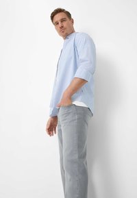 Man draagt lichtgrijze jeans met rechte pijpen, zwarte sandalen met dubbele bandjes, wit T-shirt en blauw gestreept overhemd met knopen.