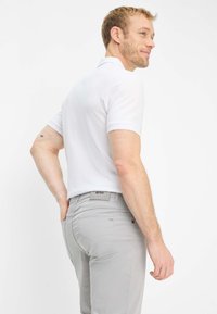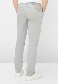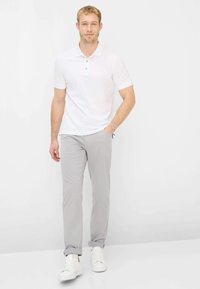 Lichtgrijze chino's met een slim fit, voorzien van vijf zakken, zichtbare stiksels en opgerolde pijpen, gecombineerd met witte sneakers.