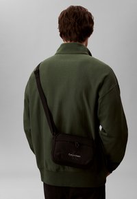Persoon draagt een olijfgroene jas met een zwarte Calvin Klein crossbodytas die over de schouder hangt, met de rug naar de camera gekeerd.