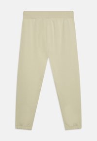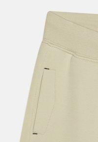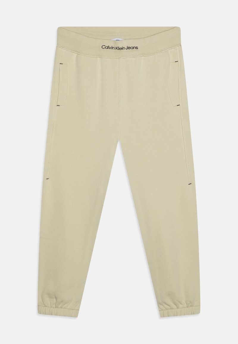 Beige Calvin Klein Jeans casual broek met elastische boorden, zijzakken en logo op de tailleband, plat uitgestald tegen een witte achtergrond.