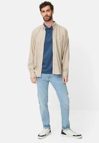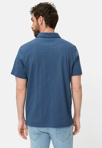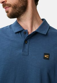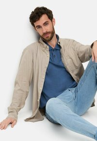Man met krullend haar en baard, gekleed in een blauw poloshirt met korte mouwen en lichtblauwe spijkerbroek, staand tegen een effen achtergrond.