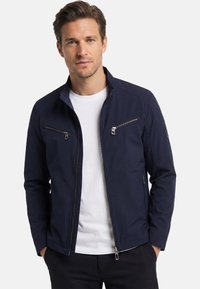 Man draagt een marineblauwe jas met rits en twee borstzakken met rits, over een wit t-shirt, staat met handen in de zakken.