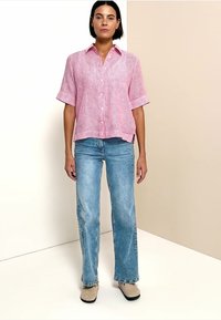 Vrouw draagt een roze gestreept overhemd met knopen en een blauwe spijkerbroek, met een grote lichtblauwe tas over de schouder.