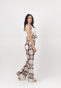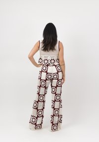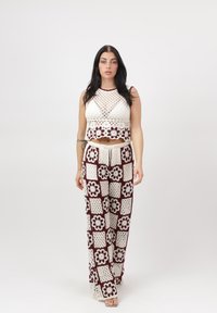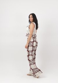 Vrouw staat met handen in de zij, draagt een wit met bordeauxrood gehaakt topje en bijpassende wijd uitlopende broek met bloemenpatronen.