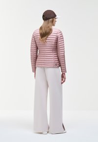 Vrouw draagt een lichtroze doorgestikte jas met rits en zijzakken, witte broek en een bruin-witte pet met een logo in schriftstijl.