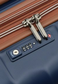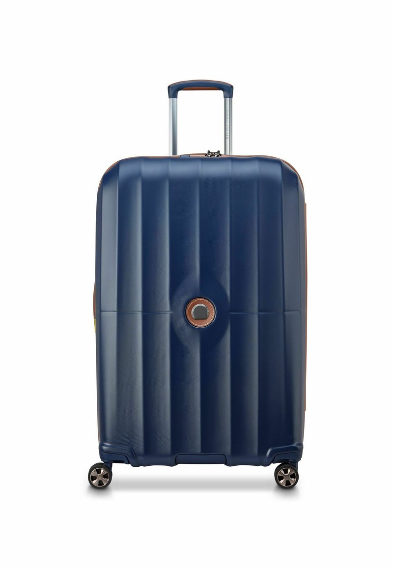 Navy hardshell koffer met gestreepte textuur, zilveren telescopische handvat, bruine accenten en vier zwarte wielen voor mobiliteit.