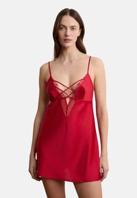 Vrouw gekleed in een zwarte satijnen slipjurk met kantafwerking en gekruiste bandjes bij de borst, poserend met één hand op haar heup.