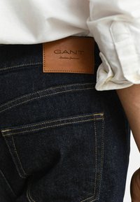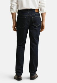 Man met donkerblauwe slim-fit jeans, wit overhemd met opgerolde mouwen en donkerbruine leren loafers, staand tegen een witte achtergrond.
