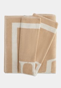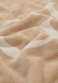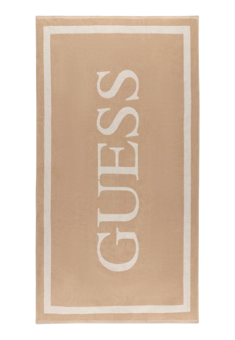 Beige rechthoekige handdoek met witte rand en de merknaam GUESS in grote witte letters verticaal gedrukt.