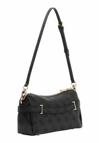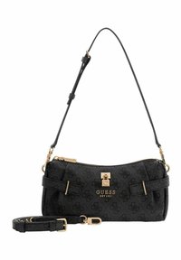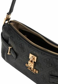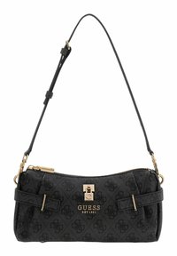 Zwarte synthetische handtas met gouden beslag, voorzien van een ritssluiting, afneembare riem en een verdiept logo-patroon. Meet ongeveer 25 centimeter.