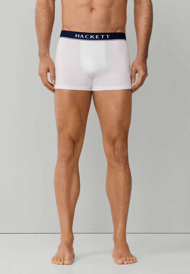 Mannelijke torso en benen in witte Hackett boxershorts met een marineblauwe tailleband, staand op blote voeten tegen een effen lichtgrijze achtergrond.