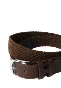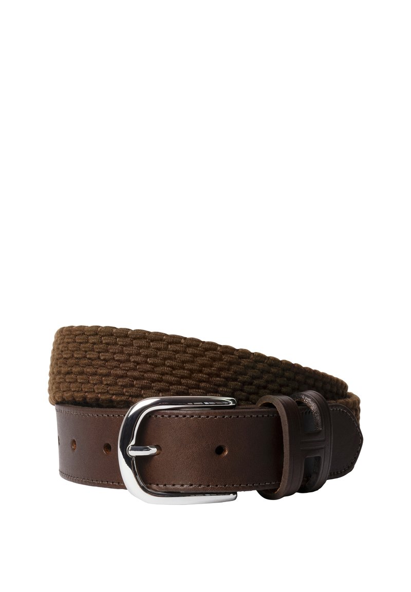 Bruine geweven stof en leren riem met zilveren metalen gesp, opgerold tegen een witte achtergrond.