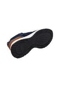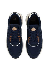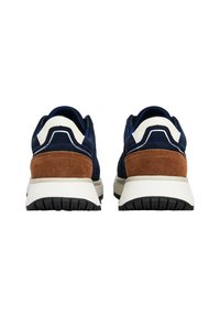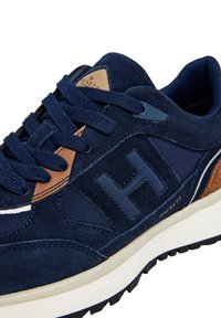 Marineblauwe sneaker met suède en leren panelen, bruine hielaccent, witte tussenzool, zwarte zool en een "H"-logo aan de zijkant.