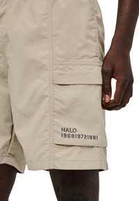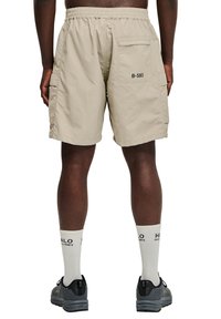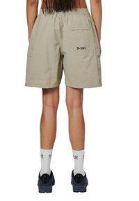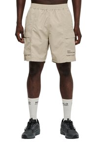 Man draagt beige cargoshorts met zijzakken, witte sokken met logo en zwarte sneakers, staand tegen een witte achtergrond.