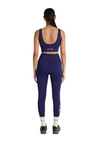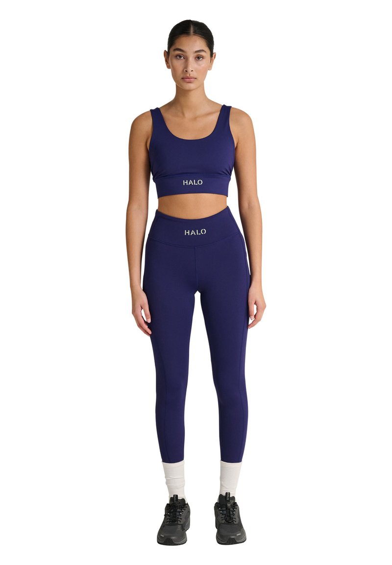 Vrouw staat, gekleed in een marineblauwe sportbeha en legging met het logo "HALO", witte sokken en zwarte sneakers tegen een witte achtergrond.
