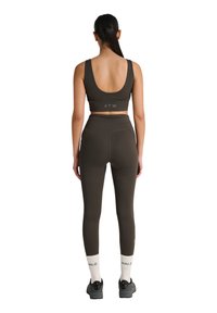Vrouw kijkt recht vooruit, draagt een donkerolijfgroene sportbeha en legging, witte sokken en zwarte sneakers, tegen een witte achtergrond.