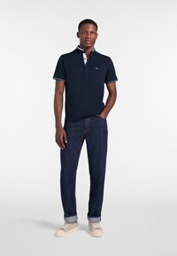 Man draagt een marineblauw polo met korte mouwen en witte biezen op de kraag en mouwzomen, gecombineerd met donkerblauwe jeans, staand tegen een effen achtergrond.