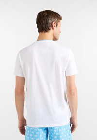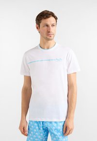 Wit T-shirt met korte mouwen, lichtblauwe kraagafwerking en een horizontale blauwe lijn over de borst; heeft een palmbomenlogo aan de linkerkant.