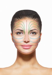 S‘ Morgens: Wij raden aan om de massage van het gedeelte om de ogen na het aanbrengen van de crème, behandeling of van de balsem uit te voeren. s‘ Avonds Wij raden aan om de massage van het gezicht, de oogzone, de halszone en het decolleté na het aanbrengen van de vochtcrème uit te voeren. Ogen: Voer het massageapparaat over het beweeglijke ooglid van het tranenzakje tot de hoek van het oog en daarna over het bovenste lid (onder de wenkbrauw). Voer het in het gebied tussen de wenkbrauwen met beide kanten van het massageapparaat in heen en weer gaande bewegingen uit. Met de andere kant van het massageapparaat licht op de gemarkeerde plaatsen drukken. Mond: Voer het massageapparaat met lineaire bewegingen om de mond heen. Voer nu met de andere kant van het massageapparaat hetzelfde in cirkelende bewegingen uit. Neus: Voer het massageapparaat zachtjes over de neus naar boven en van de ene kant van de neus naar de andere. Dekolleté: Ga met opwaartse bewegingen van de borstspier tot het sleutelbeen over het decolleté. Voer dezelfde bewegingen met de andere kant van het massageapparaat uit. Hals: Voer het massageapparaat over de halslijnen van de ene kant naar de andere en van de kaak tot aan de oren. Herhaal met de andere kant van het massageapparaat met cirkelende bewegingen. Wangen: Voer het massageapparaat over de wangen naar boven in de richting van de ogen. Herhaal met de andere kant van het massageapparaat met cirkelende bewegingen. Voorhoofd: Voer beide kanten van het massageapparaat over de rimpels van het voorhoofd van de ene naar de andere kant. Voer de massageapparaat vanaf het begin van de haren naar binnen. Herhaal alle oefeningen drie keer.