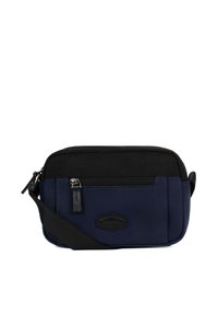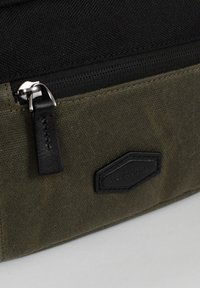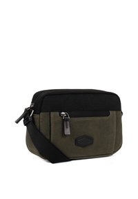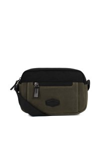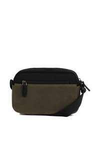 Compact rechthoekige crossbodytas in olijfgroen en zwart met voorvak met rits en verstelbare zwarte band.