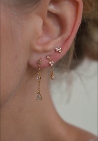 Gouden oorcuff met drie kleine edelstenen, voorzien van een gebogen ontwerp dat de oorlellen omarmt. Gladde metalen oppervlakte met een gepolijste afwerking.