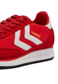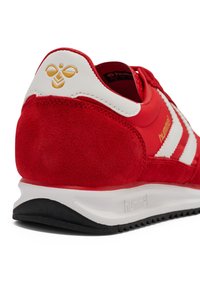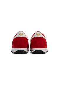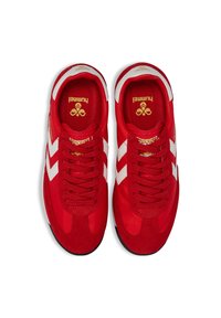 Rode low-top sneakers met witte chevronstrepen, zwarte zolen en "hummel" branding aan de zijkanten, getoond vanuit een vooraanzicht onder een hoek.