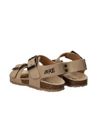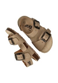 Tan lederen sandalen met twee verstelbare banden, zilverkleurige gespen en een kurken voetbed. Textuur outsole voor grip; merklogo op de band.