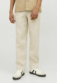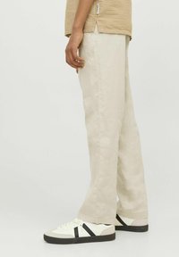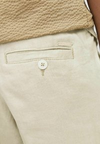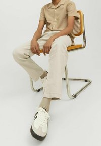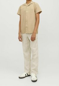 Beige overhemd met korte mouwen en een gestructureerde afwerking, met knopen aan de voorkant, gecombineerd met lichtgekleurde broek en zwart-witte sneakers.