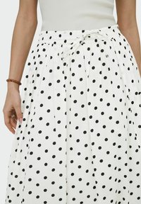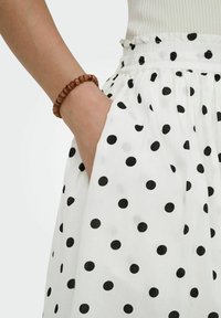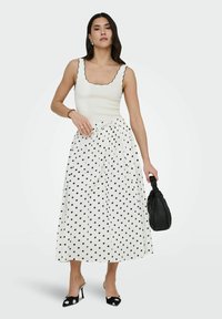 Vrouw draagt een witte midirok met zwarte polkadots, houdt een zwarte handtas vast en draagt zwarte en witte polkadot pumps.