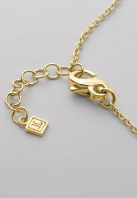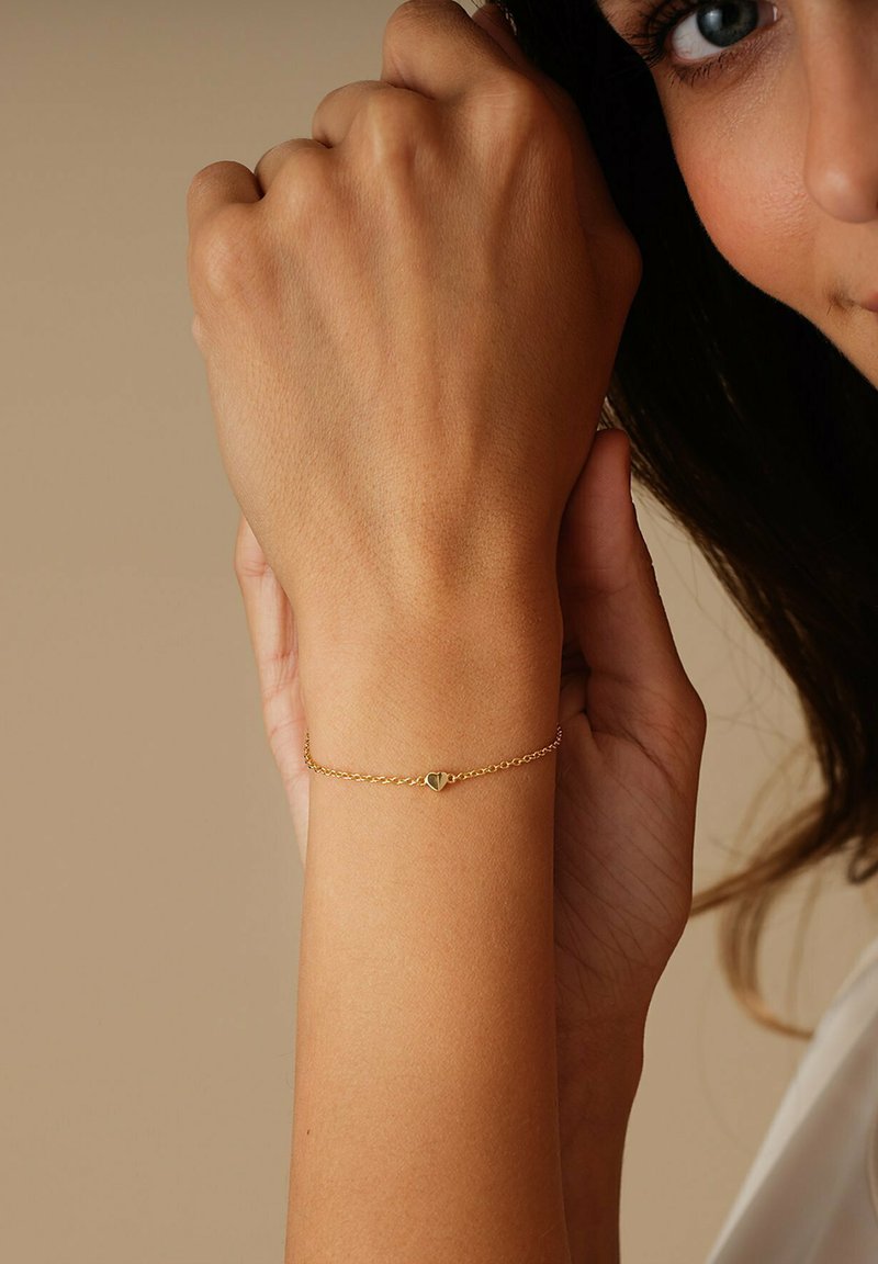 Pols met een delicate gouden armband met een kleine hartvormige hanger, zacht vastgehouden door de andere hand tegen een neutrale achtergrond.